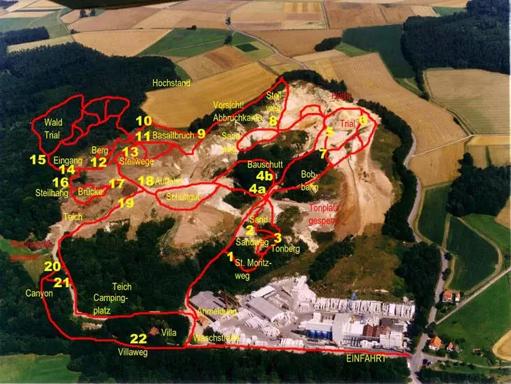 Het terrein heeft een uitgebreid netwerk van paden, die u met behulp van een routekaart zelfstandig kunt verkennen. De route voert je door bosgebieden met veel obstakels die overwonnen moeten worden en door het bovengrondse mijngebied met klei- en zandafgravingen, basaltgroeven, waterpoelen, steile bergen en afdalingen op de meest uiteenlopende ondergronden